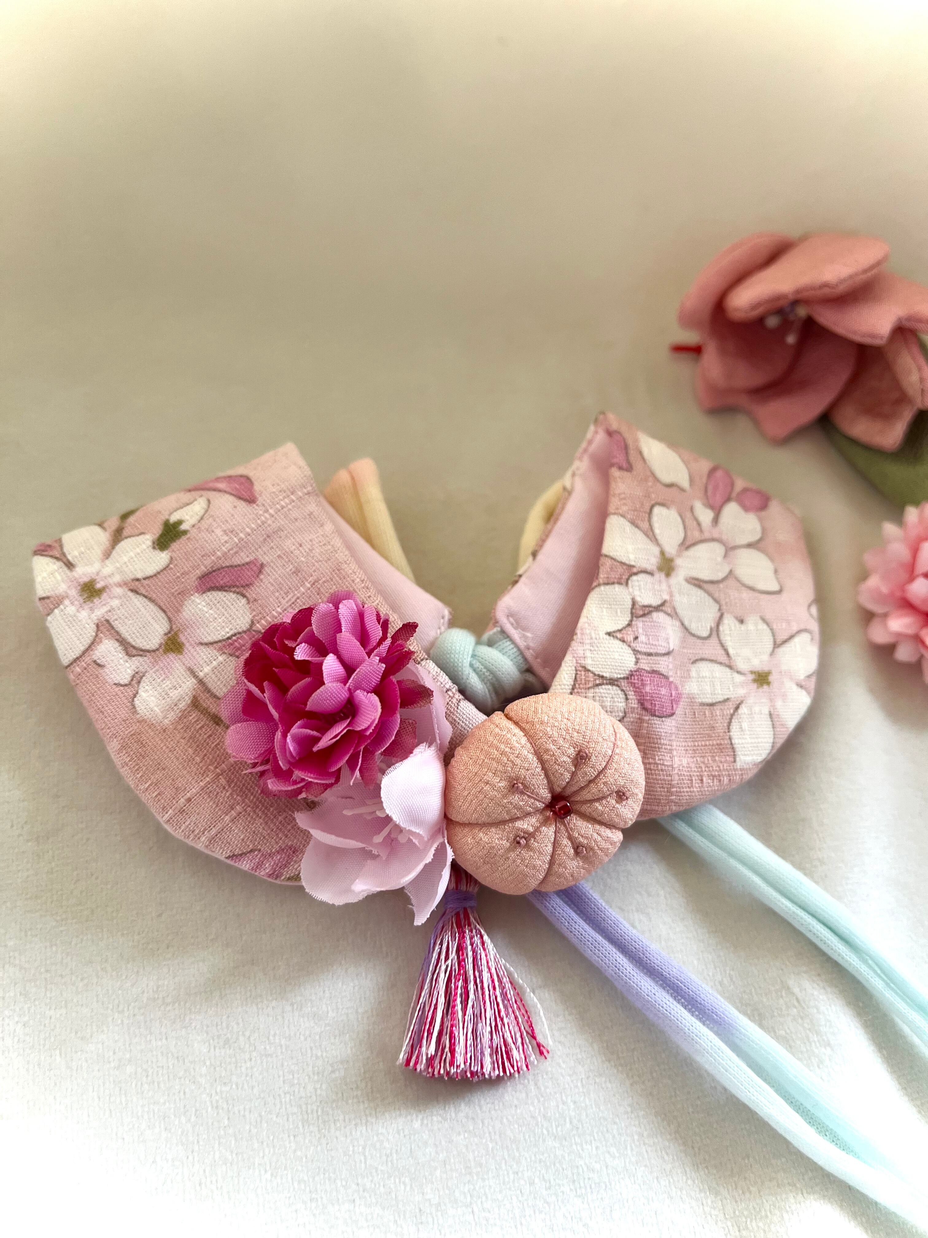 マム、桜、ちりめん細工、タッセルを合わせました。