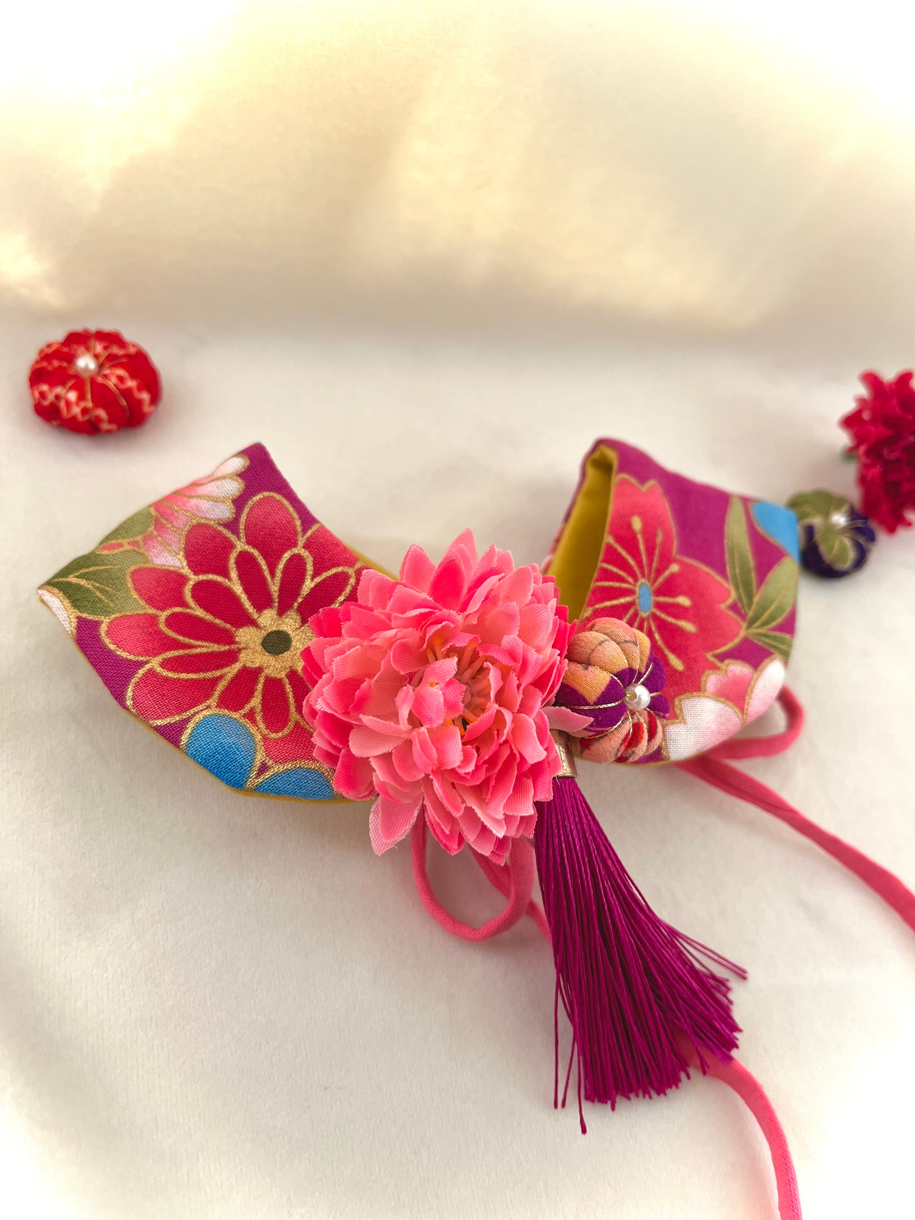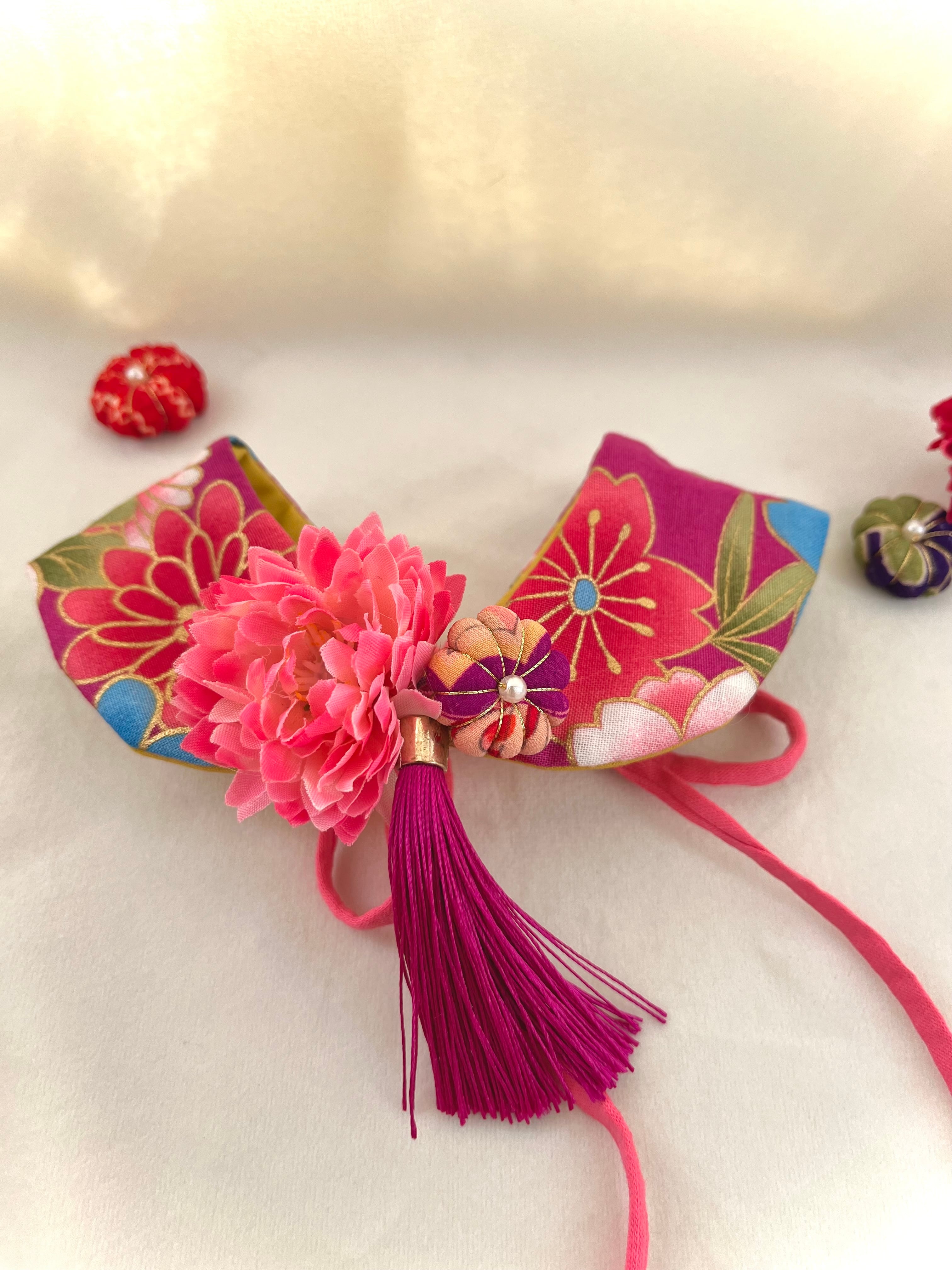 美しいお花の和柄が施された生地に、マム、つまみ細工を合わせました。